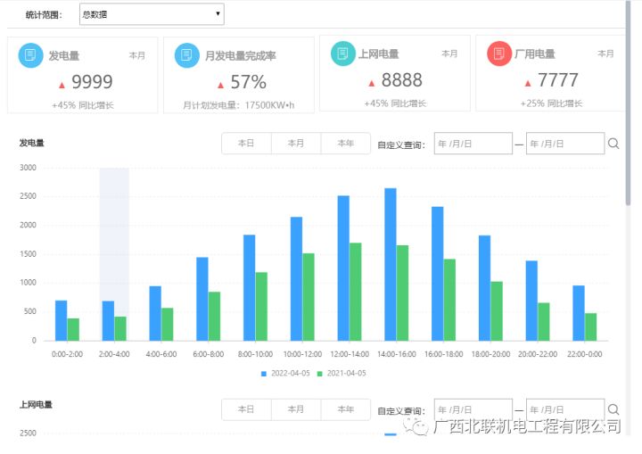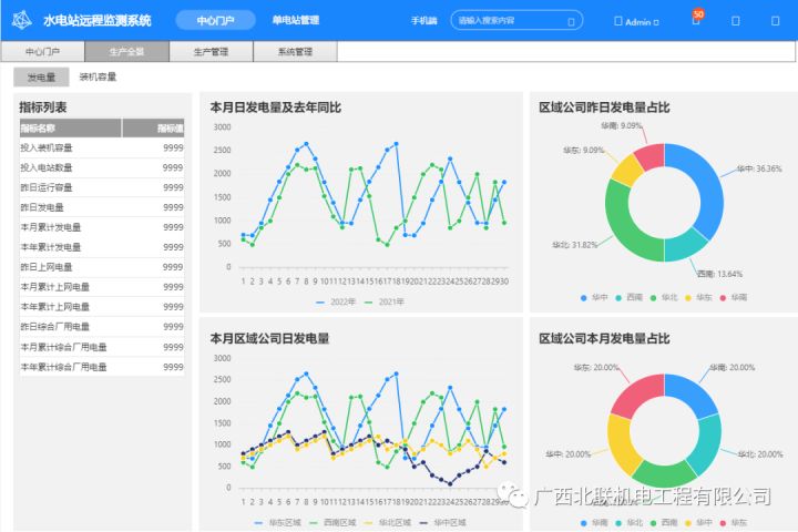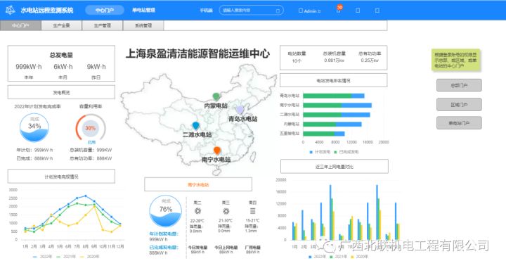 水电站分布位置、总发电量、计划发电完成率、电站发电排名情况、电量对比等。